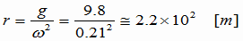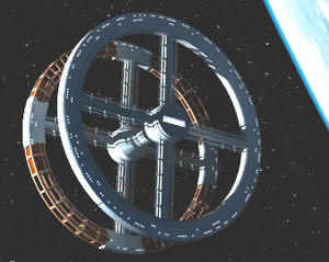 例題 宇宙飛行士が長時間宇宙に滞在すると、無重量状態が身体に影響を及ぼすことが分かっている。そこで長い間宇宙で暮らすための宇宙ステーションは、 図のようにリング状にして常に回転させている設計にすれば良い。こうすれば,外周部では遠心力が人工重力となり,地上のように暮らすことができる。1分間に2回転(=0.21rad/s)で回転させることにすると、リングの半径を何mにすれば、地上の重力加速度9.8m/s2と同じにできるだろうかか。計算せよ。 |