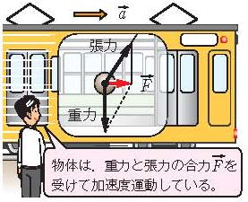 | <電車の外にいる人の視点> 重力と張力との合力 が重りにかかっている。その合力が重りに加わわるので、重りは加速度運動をしている。重りについての運動方程式は となる。 |