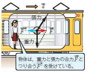| <電車の中にいる人の視点> 重力と張力との合力 が重りにかかっても静止しているのは、後方向きの力 'を受けているためと考えられる。つまり、力のつりあいだ。![]() 運動方程式を書くなら である。 |