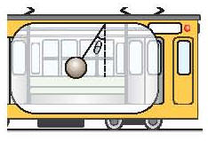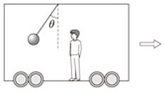 | 5 水平に等加速度直線運動をする電車内に,おもりが天井から糸でつるされている。図のように,電車内の観測者には,おもりは,糸と鉛直方向とのなす角がθとなる位置で静止して見えた。重力加速度の大きさをgとする。 |