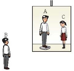| 練習問題 4 一定の加速度で運動するエレベーターの中で,質量60 kgの人Aが体重計に乗ったところ,体重計は66 kgを示した。 次の問に答えよ。ただし,鉛直上向きを正とし,重力加速度の大きさgを9.8 m/s2とする。 (1)BとC、それぞれの視点でAの運動についての運動方程式を立てよ。 (2)エレベーターの加速度を求めよ。 答え(2)鉛直上向きに0.98 m/s |